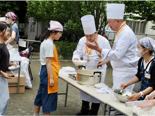 災害時には物流が止まり、スーパーやコンビニでも食品が手に入りにくくなります。ライフライン、電気、水道、ガスがすべて止まってしまった!を想定し、こんな時はどうする!? 衛生面、配膳・回収・ゴミ処理までを含めた炊き出し訓練を行った。そして、今回は小学生の子供たち20名が主役です。包丁の使い方、野菜の切り方などを教え、実際に自分たちで切った野菜を使用した。ゴミを出さないを基本として、野菜は全て皮つきで食べる、エネルギーは最小限で済むように、野菜は薄くきり時短調理とした。野菜の旨みが調味料、野菜だしでの「うま味」を大人の方々への食育授業も兼ねた。